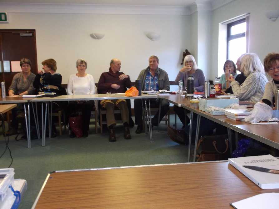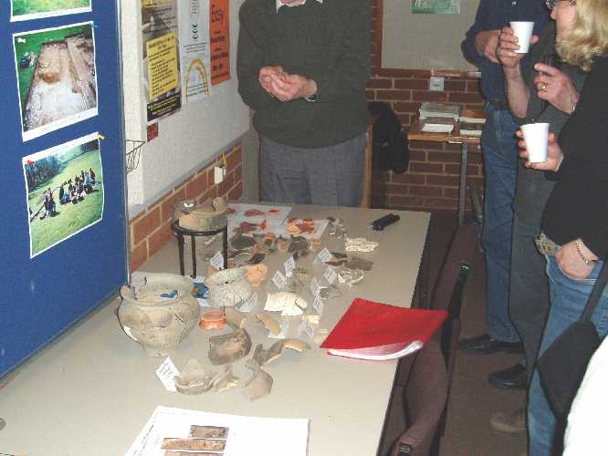Malcom Lyne examing pottery from Rocky Clump at a dayschool Nov 2011 |